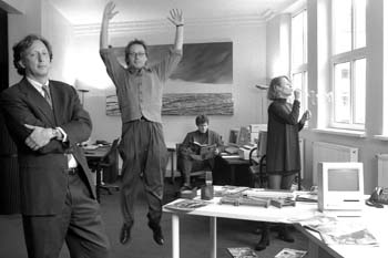 Franklin Hollander ist ein wunderbar einfühlsamer Fotograf, der zuletzt zahlreiche Star-Portraits angefertigt hat, unter anderem von Reinhold Beckmann und Sarah Connor. Seine Art der klassischen Schwarzweißaufnahmen (beispielsweise von Ulla Meinecke) hat Kollegen wie Jim Rakete inspiriert. Und sie ist immer anregend zusehen wie die Galierien auf seinen Seiten zeigen. Hier ist die TWEN-Mannschaft beim einem Relaunch Ende der Neunzigerjahre zu sehen, der für verschiedene große deutsche Zeitungsverlage vorbereitet wurde, die sich dann aber zu mutlos zeigten.